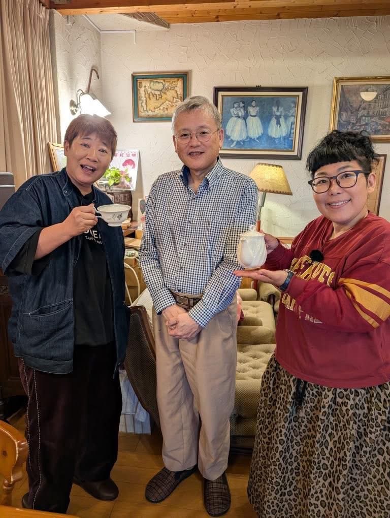10月5日に新見市観光大使の「チキチキジョニーさんと巡る旅」ご一行様がアーリーモーニングへお越しになられました。アフタヌーンティーを楽しんでいただき、紅茶畑で茶摘み体験。のんびりとお過ごしいただきました。今回は地元のケーブルテレビの取材も入りました。中国四国地方で放送られるそうですので、ご覧いただけるかもですね。